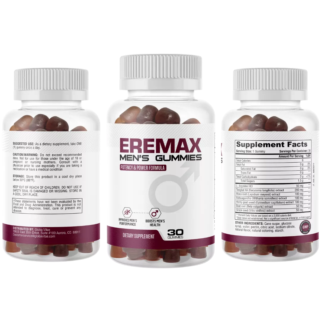 Eremax Gummies is a dietary supplement designed to support male sexual health through a natural, scientifically-backed formula. The gummies contain a powerful blend of ingredients including L-Arginine, Horny Goat Weed, Maca Root, Tongkat Ali, Beet Root, and Ashwagandha that work synergistically to enhance sexual performance.
